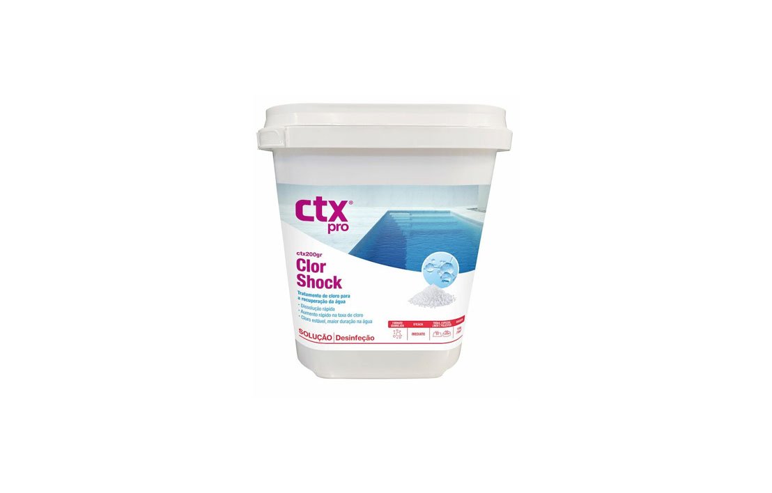 Tratamento Início da temporada: Adicionar 15 grs. de ClorShock por cada m3 de água. Passadas 2 horas, ajustar o pH da água entre 7,2 e 7,6 utilizando ctx 10 pH Minus sólido ou ctx 20 pH Plus sólido.